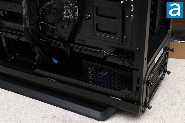 As usual, I started by installing the power supply. Since this is a silence-focused build, I chose the Seasonic PRIME 600 Titanium Fanless 600W to ensure no noise would come from the power supply. This power supply is a bit bigger at a length of 170mm, but there was more than enough room in the basement of the be quiet! Silent Base 802. According to be quiet!, the case can hold units up to 288mm in length, which is far more room than you probably will need. However, the good thing is that there is a lot of cabling space even with the front drive cage installed. I then used the tie down points and included Velcro straps to secure the cables in. Afterwards, I installed a WD Blue 1TB hard drive into the drive cage and routed the necessary cables. Since the fan controller is SATA powered, I connected the controller now.
