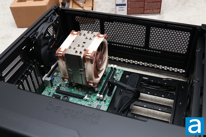 Moving to the interior, I ended up installing a test mATX motherboard into the be quiet! Silent Base 802. Although a much larger motherboard can fit in the case, this was what I had on hand. With a Noctua NH-U12A mounted on top, you can see the Silent Base 802 has much more room to spare. This cooler measures 158mm tall, but be quiet! mentions you can install coolers up to 185mm. At this time, I connected all of my power cables to the motherboard. Next, I would install a graphics card, as be quiet! notes the Silent Base 802 can easily accommodate video cards up to 432mm with no hard drive cages installed at the front. This should be sufficient for practically any graphics card, including the latest NVIDIA Ampere or AMD RDNA2 cards, assuming you can get your hands on them. Otherwise, I finished cabling everything and cleaning it up. Even with the thick sound dampening material, there was sufficient spacing between the back and the side panel for thicker cables. The be quiet! Silent Base 802 was easy to build in, but part of this is because the case was very large. I also appreciate the many rubber grommets and cable tie points to keep your cabling in check.