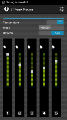 The Recon has two modes, automatic and manual, for controlling the fans. Modes can be switched between with a tap near the top left corner of the touchscreen. When automatic mode is selected, the Recon can set individual warnings temperature thresholds for each channel. This means when a warning temperature threshold is reached, the Recon will sound an alarm and increase the fan speed on that channel to 100%. The fans will remain at this speed until the temperature measured has returned to a level below the warning threshold. This threshold, of course, is user configurable. When running in manual mode, all settings are defined manually, and no warning temperature threshold will be detected. Rather than deciding a single temperature, each of the individual channels' fan speeds are decided by user. This is done through the +/- buttons, which increase or decrease the fan speed respectively. Moving to the right of that, you will find a temperature reading that indicates the temperature of the area you have specifically placed the fan. The unit for the temperature reading are given Fahrenheit or Celsius, and are toggled by a simple touch of the screen.