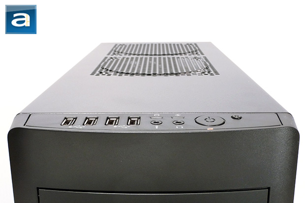 When peering at the front panel, the clear lack of a USB 3.0 port is a little bit depressing. Essentially, it makes it only possible to have USB 3.0 ports located at the back, but like everything low cost, you are will need to compromise a bit. On the other hand, you will get four USB 2.0 ports instead, which is more than enough for most people. In addition, there is a microphone and headphone jack to suit your basic audio needs. Now those are fairly typical features, but I have definitely had a chassis in the past that didn't have any front audio I/O. It was many years ago, and thankfully, nowadays even value cases have these ports as standard. Above the audio ports are two LED lights; one for the disk activity and the other for system power -- handy and simple.