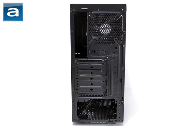 After performing a majestic 180 spin, we can see the back side of the BitFenix Merc Alpha. From this angle, you can see the one and only fan that comes with the case. It is just a plain 120mm fan for rear exhaust of the computer; right beside the motherboard I/O panel. I'm curious to see how much cooling this single fan can actually provide. Certainly, this case is not something I would want to be overclocking heavily inside of. I have a feeling this fan provides a negligible amount of cooling. Immediately below the exhaust fan, you will see two holes that can be used for water cooling; however, BitFenix doesn't provide rubber grommets for these holes. Hopefully you aren't thinking about using water cooling inside of this mid-tower. Jumping to the very bottom, you can see the opening for the PSU, providing the typical openings and holes to secure your power supply.