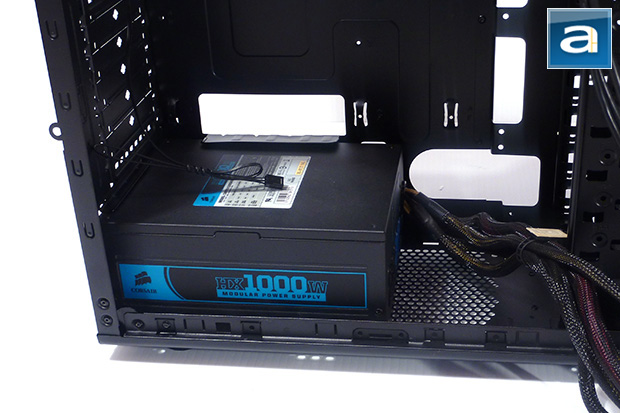Installation was a relatively smooth process, with only a few hiccups in between. I will outline the hiccups as I go through this section. Naturally, I started with the power supply, at it is a good place to begin. As you can see in the above picture, my PSU is a bit larger than what the BitFenix Merc Alpha is designed to handle. Not only does it cover a part of the bottom vent for the optional 120mm fan, it also makes the power supply brace provided absolutely useless. They just don't have the holes for me to attach the brace. I am also not convinced that the brace is even required in the first place, but if you have a small enough PSU, you might as well take advantage of what is given to you. I do like the nice large opening for me to route my power cables to the back side of the chassis. This opening is not only located in the perfect location, but it is also sufficiently large to accommodate a wide variety of power cables.
