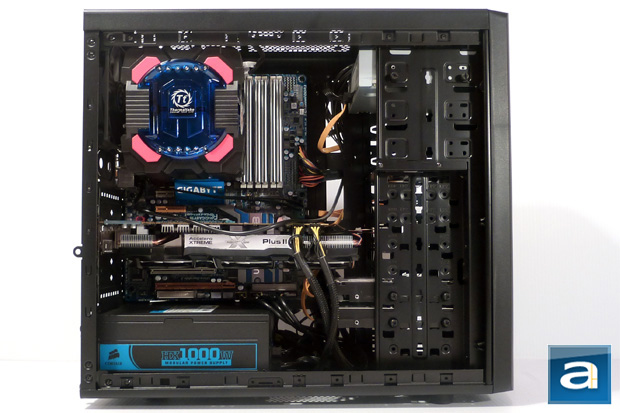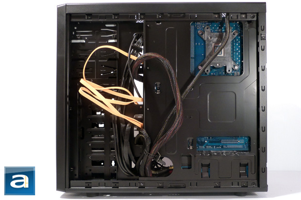 Ignoring my non-professional cabling job on the back side, I just wanted to point out how much room is available for the backplate of the CPU cooler. It has plenty of space, and the CPU opening extends out more to the front than most cases. You can also see the large number of openings for routing cables through the back side. This gives you lots of flexibility, and an easy to work with area for cables. With everything installed, let's take a look at the final product.