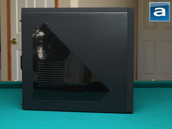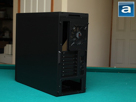 The other side panel features nothing too special, other than the fact that it is simply painted black, made of steel, and kept in place by two thumbscrews. The back panel features a pretty standard layout. It could be distinctly divided into three parts: Top, middle, and bottom. Featured at the top is the motherboard I/O opening and 120mm exhaust fan on the left and right, respectively. One thing to note here is that you can swap out the 120mm fan for a 92mm fan for whatever reason you may have. The middle section features seven standard PCI slots on the left, and two pre-drilled water cooling holes on the right; surrounded by ventilation holes. I would have preferred if the water cooling holes were situated at the top, since that would have been more user-friendly for organization in my opinion. Although I don't use water cooling myself, this is just my perception of where I would like certain features to be positioned. Of course, most chassis these days feature bottom-mounted PSUs, and BitFenix's Shinobi Window is no exception.