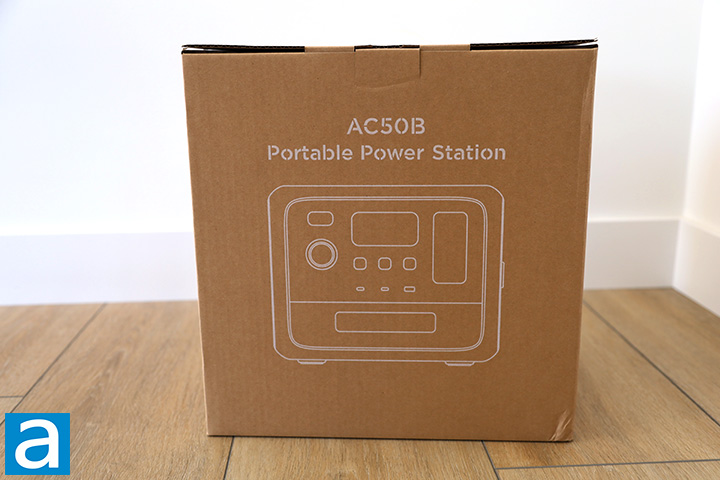The BLUETTI AC50B's retail box is as simple as it gets. The brown corrugated cardboard packaging features only white ink printing all around. What you will find, no matter what side you look at, are the BLUETTI logo, product name, and an outline of the product. At the top, you will find a list of voltages, where the one corresponding to the specific model inside is checked. I really appreciate the clean, minimalist design.