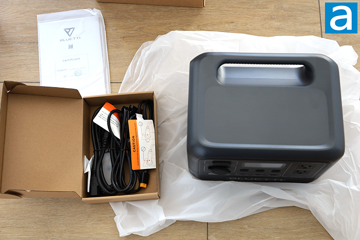 Everything is neatly organized inside the box, which includes the BLUETTI AC50B power station itself wrapped in a white plastic bag clipped between two Styrofoam brackets and a small accessories box. The accessories box contains an AC charging cable, car charging cable, solar charging cable, grounding screw, and a user manual. I feel like this is a very reasonable bundle with all the necessary cables included from the factory.