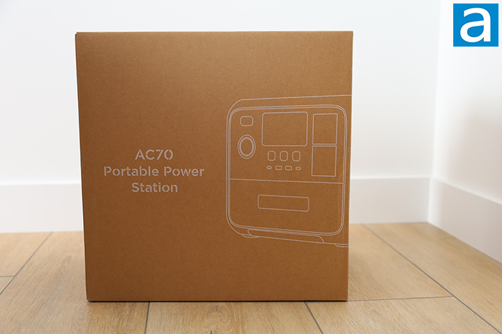 The BLUETTI AC70's retail box is as simple as it gets. The brown corrugated cardboard packaging features only white ink printing all around. What you will find, no matter what side you look at, are the BLUETTI logo, product name, and an outline of the product. At the top, you will find a list of voltages, where the one corresponding to the specific model inside is checked. I really appreciate the clean, minimalist design.