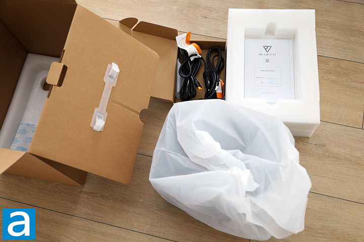Everything is neatly organized inside the box, which includes the BLUETTI AC70 power station itself wrapped in a white plastic bag clipped between two Styrofoam brackets and a small accessories box. The accessories box contains an AC charging cable, car charging cable, solar charging cable, grounding screw, and a user manual. I feel like this is a very reasonable bundle with all the necessary cables included from the factory.