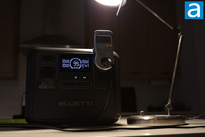 To evaluate the BLUETTI AC70, I put it through a series of tests. First, I measured its battery life in a drain test. In order to do this, I used an incandescent desk lamp that constantly draws 136W of power, as shown in the photo above. The AC70's screen showed 147W of output due to inverter loss. Still, we got 92.5% of the rated output, which is pretty good. The lamp shut off after 4 hours 58 minutes, which is 730.59Wh. This is 95% of the rated capacity, as the internal LiFePO4 battery is specified at 768Wh. The AC70 delivered as promised in this test.