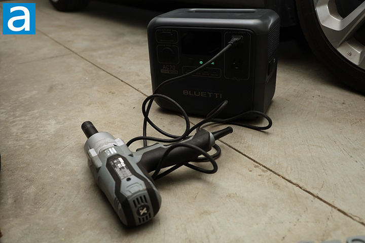 The next test is using a MAXIMUM impact wrench. This is an 8.5A high power impact wrench that I use to loosen lug nuts off my car. The purpose of this test was to see if the BLUETTI AC70 can handle over 1000W of burst output. The AC70's screen showed instantaneous 1300W output when loosening a 95 lb-ft lug nut. The portable power station delivered with no issues, and Power Lifting mode was not required.