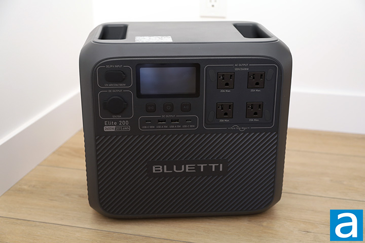 Connections in the front include a DC input to charge the BLUETTI Elite 200 V2 using your car or solar panels, not included. Outputs include a 12V/10A DC automobile auxiliary power outlet, two 100W USB Type-C, two 15W USB Type-A, and four 120V/2400W NEMA AC outlets that can have a combined output of 2600W. This is plenty of outlets for basically anything you can realistically throw at it.