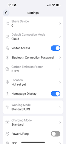 Common to both Wi-Fi and Bluetooth, you can toggle features like charging mode, Power Lifting mode, AC frequency, and ECO mode, just like the onboard LCD screen. The only thing you cannot do in the app is turn Bluetooth off, which can only be done on the system itself. This is a logical design choice in my opinion.