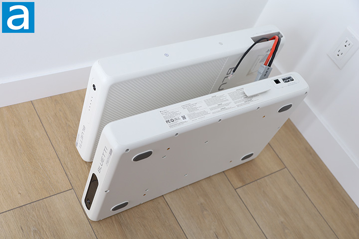 Tipping the FridgePower and BlueCell 200 over, and we can see how the two connect together. The power and RJ45 CAN connections are located on the opposite, but corresponding, sides of each other, which allows for easy daisy chaining if you have them mounted side-by-side on the wall. The BlueCell 200 also has the power and RJ45 CAN connections on the opposite side like the FridgePower for daisy-chaining additional BlueCell 200 units as aforementioned. Each unit can go from 0 to 80% in 60 minutes and fully charge in 105 minutes. You can charge and run devices off the FridgePower system at the same time, and its 10ms response time gives it UPS capabilities. We will test the performance of this device in just a moment.