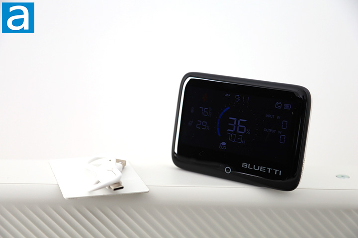 Here is a look at the BLUETTI Display 1 module. It measures 11cm wide, 7.7cm tall, and 1.5cm thick. It weighs 155g, and has a built-in magnet. I tried sticking it to my fridge, and it held on quite securely. BLUETTI includes a metal plate in case the surface you want to attach it to is not very strong magnetically. If you do not have anything to stick it to, a stand swings out the back for it to stay upright on its own. There is a USB Type-C port on the left to charge the Display 1's internal 2000mAh battery. A USB Type-C to Type-A cable is included.