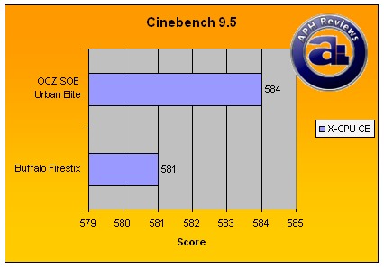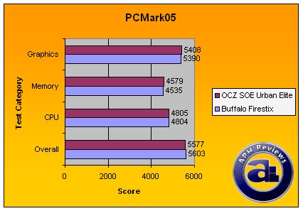 Virtually identical performance is tested in PCMark05, but the OCZ SOE Urban Elite seems to have a slight edge in most of the tests. Strangely, the PCMark05 Overall mark is higher with the Buffalo Firestix. This could not necessarily be RAM related, as chances are due to hard drive temporary burst differences.
