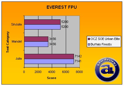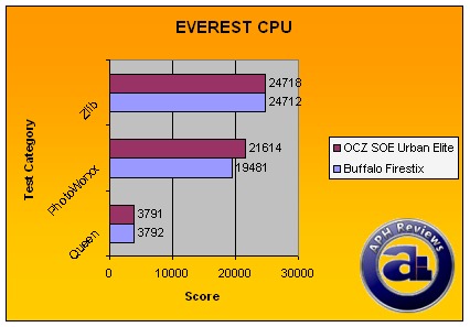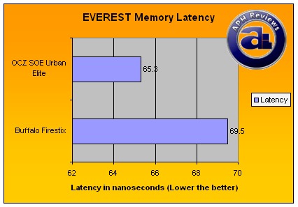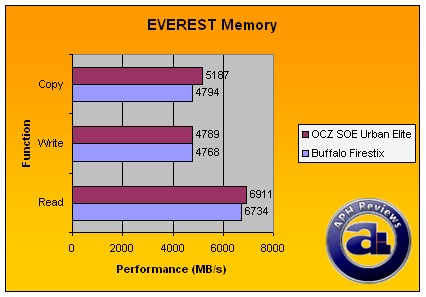 Again, virtually identical performance on most tests. However, in the EVEREST CPU PhotoWorxx benchmark, the OCZ SOE Urban Elite had quite a performance edge (At least on paper). Also worth mentioning is information presented in the EVEREST Memory tests -- the OCZ SOE Urban Elite had a nice lead on the Copy and Read tests. The latency tested is also lower than the Buffalo Firestix.