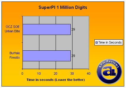 29 seconds to calculate 1 million digits of Pi for both. On the other hand, if you want to calculate Pi faster, you might want to consider a faster CPU with nice overclockable memory (An E6300 running at 2.8GHz can calculate it in 19 seconds). We'll see how well the Buffalo Firestix overclocks right up next.