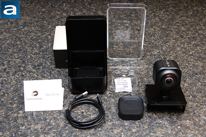 After peeling off all the Camorama branded tape, you can take apart the clear hard plastic shell and expose the Camorama 4K 360 degree camera. Out of the box, you will receive the Camorama itself, a magnetic lens cap, Micro USB to USB Type-A cable, and a quick start guide. There is not a whole lot of stuff out of the box, but everything you need to get going is here.
