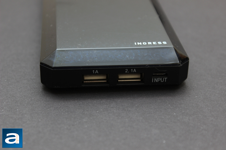 Near the bottom of the cheero Ingress Power Cube are three input and output ports. From left to right, there are two full sized USB 2.0 ports. One is listed as 1A output, while the next is listed as 2.1A output. As you might have already guessed, this specifies the maximum current output from each port. Both of the ports follow the standard USB output of 5V. Seeing two ports is great for several reasons. For one, this means the cheero Ingress Power Cube is capable of charging multiple devices at the same time. Secondly, it also means it can handle higher current draws from larger devices such as tablets. Unfortunately, there is no support for Qualcomm's QuickCharge technology. The battery inside is a massive 12000mAh lithium ion battery. This means the cheero Ingress should have no issues charging your phone, or even your tablet, multiple times. Finally, there is a micro USB 2.0 port to charge the Ingress itself. According to cheero, the Ingress Power Cube should also be capable of being cycled 500 times, which is standard for most cells. In addition, they state the Ingress Power Cube will charge from zero to full in around ten hours, assuming you use a 2A USB charger. There are also several protection features with the Ingress Power Cube, including protection from overcharging, over-discharging, short circuiting, and overheating.