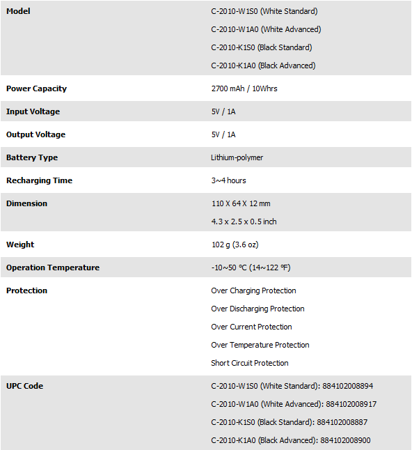 I found the Choiix Power Fort retail packaging simple, clean, and eye-catching. All its contents are neatly packaged in a clear hard plastic box. The front label shows its compatibility with the iPhone, iPad, Blackberries, and PSP, as well as products from Nokia, Motorola, Sony Ericsson, Samsung, HTC, and LG. Behind this label is the Power Fort itself. Everything is packed neatly in one convenient main box, with a secondary box located behind the Power Fort for the rest of the accessories. The dividing middle section is completely white, and is used as a background for the Power Fort, which is located in front of it as aforementioned. The 'Power Fort' product name is situated at the top, stylized with different icons for eye candy, with Choiix's logo printed at the bottom. Flipping the box around reveals its features, specifications, and package contents, as well as the estimated extra hours you will get for some of the devices. We've extracted a bunch of this information for you. So before we move on, let's take a look at the features and specifications of this product, as obtained from Cooler Master's website: