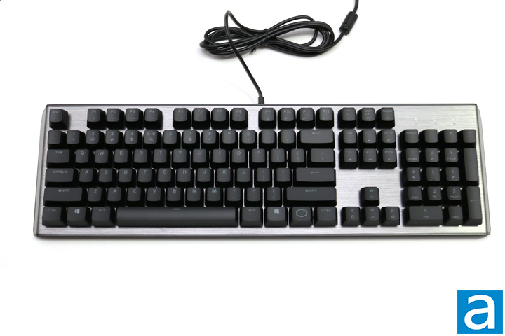 The Cooler Master CK550 has a great design. I always appreciate an aluminum backplate, as it gives the keyboard a quality feel while improving build quality. The brushed aluminum curves down at the left and right ends, extending the keyboard a little further in each direction, but the overall aesthetic is pleasing. Furthermore, the keys themselves sit slightly raised above the aluminum, meaning quite a bit of light escapes from the bottom when the RGB LEDs are active. The grey aluminum also reflects some of this light, but we will have a closer look at that later in the review. The keycaps are laser-etched ABS, which are of average quality. They do attract oily marks, but it is easy enough to clean. The grey color is the only difference between the CK550 and the CK552 that my colleague Aaron Lai reviewed. The CK552 features a midnight black color instead. Otherwise, the only indication the CK550 is a Cooler Master keyboard is the minimalist logo found on the function key. We also find the usual LED indicators at the top right of the keyboard, which are white LEDs. Lastly, the keyboard has a standard 104-key QWERTY ANSI layout, with no changes made to the spacing either.