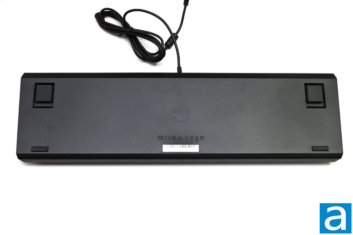 The back of the Cooler Master CK550 is fairly straightforward. At the top right and left, are two little feet that can be extended to angle the keyboard down a bit. These feet are covered in rubber to grip whichever surface they are on. At the bottom left and right, are two small rectangular rubber feet to keep the keyboard in place on any surface. Out of the top of the case, we find a 1.8m rubber cable. Inside of the keyboard, we find a 32-bit ARM Cortex M3 processor as well as 512KB on board memory. It boasts impressive specifications to store the necessary profiles and other settings you may save onto the CK550.