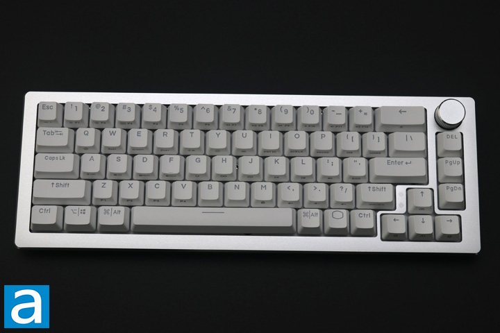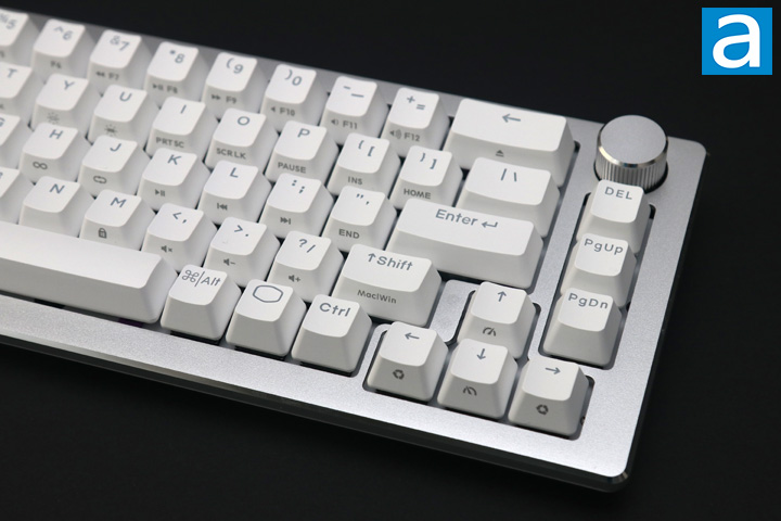 Like the CK721, the Cooler Master CK720 is a 65% keyboard with a QWERTY ANSI layout. The whole keyboard is generally standard, although there are some layout changes due to its chopped down size. For example, the bottom row uses 1U sizing for the right Alt, Fn, and Ctrl keys. This allows for the cluster of arrow keys on the right. Similarly, the right Shift key is not as wide to accommodate the Up key. At the top, we have no F keys here, while the right side is missing the number pad and the cluster of six keys above the arrow keys. Instead, the right side has non-standard positions of Delete, Page Up, and Page Down. The rest of the keys in the cluster have been moved into secondary functions.