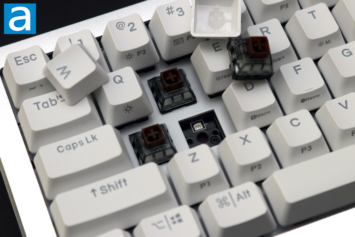 Our unit of the Cooler Master CK720 features two highlights here. For one, we have Kailh Box V2 Brown switches. While I have seen Kailh switches in the past as Cherry clones, they have generally improved over the years, and the Box V2 switches are common among enthusiasts. According to Cooler Master, these have also been factory lubed for a smoother actuation. These switches are guaranteed to last 80 million actuations. According to Kailh, these have an actuation force of 45g with an initial actuation distance of 1.8mm and an overall travel distance of 3.6mm. The other neat thing is that all of the switches are hot-swappable, as you can see in the image above. This is something we have seen more recently from the big brands, but is a common feature of custom mechanical keyboards. The sockets have provisions for both three- and five-hole mounts, which means it should be compatible with most enthusiast switches. As such, the RGB LEDs are surface mounted on the PCB. As the included switches have a translucent shell, this helps the light spread more. Otherwise, longer keys like the Space and Enter keys are stabilized with Cherry stabilizers that have had lube applied to reduce rattling and for smoother travel.