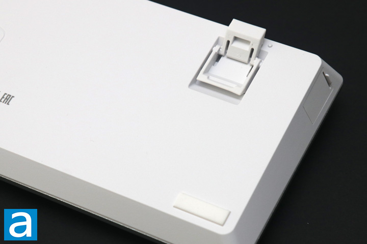 Flipping to the back side, a small area has some certification information and a serial number sticker to identify the Cooler Master CK720. In the bottom two corners, there are sizeable rubber pads to keep the keyboard in place. As for the feet, we actually have two feet on each side, propping up the keyboard to two different heights. This is pretty neat to me and the solution also takes up the same space as what a single kickstand would. All of the feet are tipped with rubber to ensure they stay in place. The feet also have more rubber facing down in case the user does not want to actually prop the keyboard up at all. On the side, you can see there is a small door that covers up the latch to for swapping out the top metal cover. Otherwise, not pictured here is the USB Type-C connection, which sits on the back edge in the middle of the keyboard.