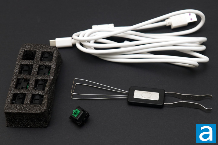 As for the accessories, we have a few included with the Cooler Master CK720. First is the combination wire keycap and switch puller, which is nice to see. It is also more flexible than plastic keycap pullers that are usually provided by competing brands. The back metal hooks also let you remove the swappable switches easily. Next, we have a rubber 1.8m USB Type-C to Type-A cable to plug the CK720 into your computer. This cable is white and matches the color of the keyboard. Unfortunately, the CK720 only operate with a wired connection. Finally, Cooler Master also packaged a set of eight Cherry MX Green switches so users can already try swapping out their switches. These are a tactile and clicky switch with a heavy 80g actuation force.