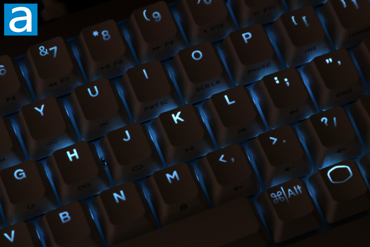 The legends on the Cooler Master CK720 with its north-facing LEDs resulted in generally bright keys illuminated for their primary functions. However, the secondary functions are mostly printed on the front of the keycap, so these parts will only be illuminated by the light that leaks out. Keys with wider legends such as the Enter or left Shift keys are brighter in the middle than the side, although it is not too noticeable. As for changing effects, Cooler Master has let users cycle through different static and reactive effects. This is all contained as secondary functions on the keys Q to U, as well as on the arrow keys. Q lets you cycle the static color. W, E, and R are used to custom pick the red, green, and blue levels, respectively, for the backlight. T is used to cycle between the different effects, while Y and U let users change lighting foreground and background effects. Finally, users can cycle between four different levels of brightness with the A key, as well as turn them off altogether. The Up and Down arrow keys are used to speed up or slow down certain effects, while the Left and Right arrows switch the lighting effect direction. Overall, the lighting customization is impressive, especially as you can choose specific colors on-the-fly.