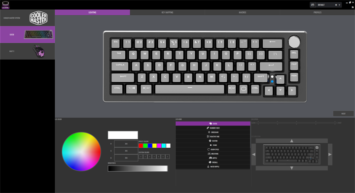 As for the MasterPlus+ software, the program generally works well. Specific to the CK720, there are a total of four different configuration pages. The first tab is called lighting, where users can pick different lighting modes as well as set their own custom modes if they desire. There are many static and reactive modes available, and you can also change brightness, speed, and direction for the applicable effects. Under the second page, Key Mapping, users can choose what each key will execute, including different keyboard commands and macros. Under Macros, users can create and record macros to be assigned to different keyboard commands. Finally, you can save up to four different profiles and settings in the Profiles tab. Unfortunately, you can see the scaling is still an issue with MasterPlus+, as the words are still too small for the size of its window. This is a minor gripe, but it should be fixed.