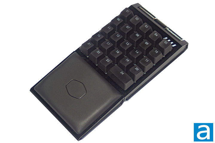 The look of the Cooler Master ControlPad is much more standard and minimalist when compared to the design of an average keypad, which typically has more of a gamer appearance. The Cooler Master logo outline on the wrist rest is a satisfying design choice, as it does not make the product look too busy and uses space that would look awkward if left blank. At first glance, the ControlPad resembles a detachable numpad due to its almost square, uniform shape, along with the keys numbered 01 to 24. It has a very small footprint, especially if the user decides not to use the wrist rest. The brushed aluminum plating on the top of the ControlPad and of the wrist rest gives it a nice weight and a premium look. The two-wheel controls at the top of the board fit in with the design well and have a grippy texture on them for easy scrolling.