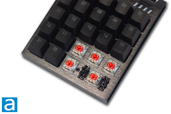 Taking a peek underneath the keycaps, our model of the Cooler Master ControlPad comes with Cherry MX Red switches. The ControlPad comes with two options, which is Cherry MX Red or Gateron Red switches. If you are unaware, red switches are linear switches. This means that when pressing the switch, there is smooth up and down travel with no tactile bump or click. The Cherry and Gateron switches both have an actuation force of 45g, 2mm travel to actuation, and a total travel distance of 4mm to bottom out. Although the specifications are the same, Gateron switches are typically smoother in my opinion, but do not have as long of a lifespan as Cherry switches. The review unit provided has Cherry MX Red switches.