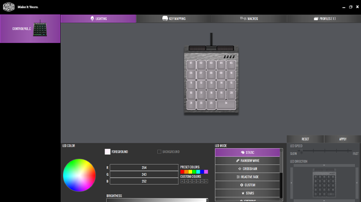 The ControlPad requires the software MasterPlus, which is a 176MB file at press time and is needed to control the key mapping and RGB colors of the keys. From the main screen, you can navigate the tabs for lighting, key mapping, macros, and profiles. The software comes with a plethora of different effects as well as individual key customization. The color can be controlled right down to the specific RGB code, giving you endless customization possibilities. In the mapping tab, you can customize every key to be regular keystrokes, media keys, controller buttons, and even dual-action button presses, which utilize the pressure sensitivity to have a half button press being one action and a full press being a different action. In the macro tab, new macros can be recorded and assigned to keys. These macros can also include delay and be set to repeat if so desired. Finally, in the profile tab, you can create up to twenty four profiles and assign different color patterns for the indicator lights. From this screen, you can also export profiles to send around to people and import profiles from the internet. The ControlPad does have 512KB of built-in memory, so you can always use your profile without having the application turned on in the background.