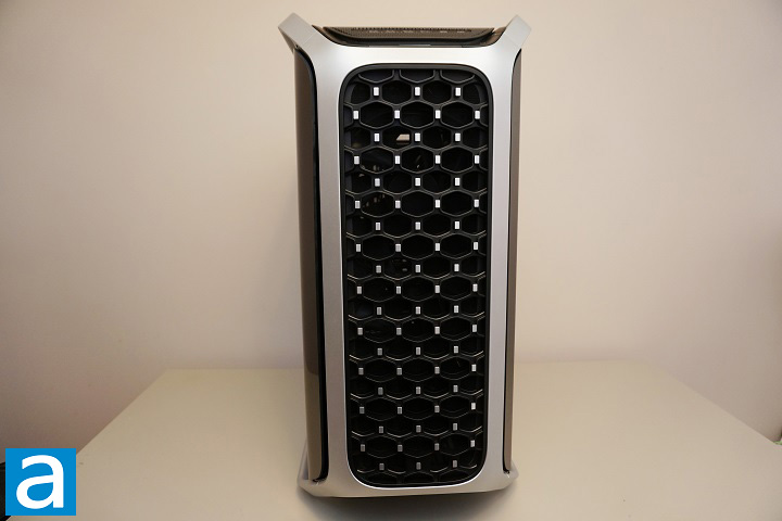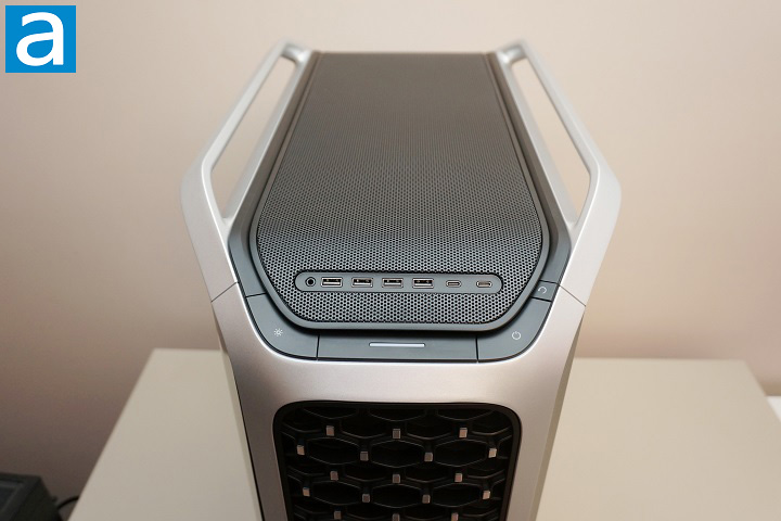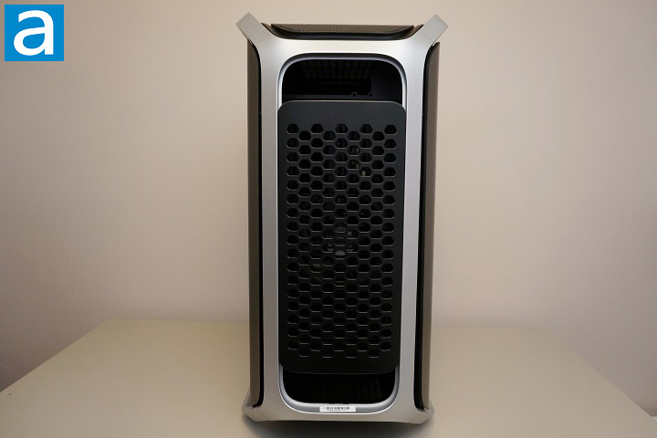The front panel of the Cooler Master COSMOS ALPHA continues the bold and distinctive styling that defines the entire chassis. Dominating the front is a large mesh intake area with a hexagonal pattern, designed to maximize airflow while still maintaining structural rigidity. The mesh sits slightly recessed within the surrounding frame, giving the front panel a layered appearance and adding visual depth to the design. On both sides of the mesh intake, the curved exterior frame pieces keep the recognizable COSMOS signature exoskeleton look. These silver structural elements are not only decorative, but also contribute to the rigidity of the chassis, while visually tying together the top and bottom handles of the case.