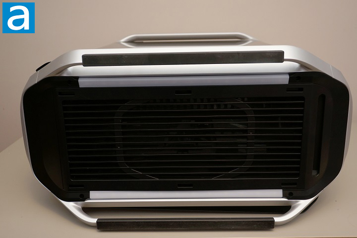To prevent the case from sliding and to protect your desk or floor, long rubber strips are attached to the underside of both stands. Between the two stands sits the large bottom ventilation grille, which is protected by a removable mesh dust filter. The filter is reinforced with a rigid plastic frame, ensuring it remains sturdy while still being easy to remove for cleaning. This bottom intake area supports additional cooling options, including multiple fans or large radiators, depending on the user’s configuration. Also visible from this angle are two long ARGB lighting bars integrated into the bottom structure of the case. These lighting strips run parallel to the frame and help illuminate the underside of the chassis, creating a subtle glow effect when the system is powered on.