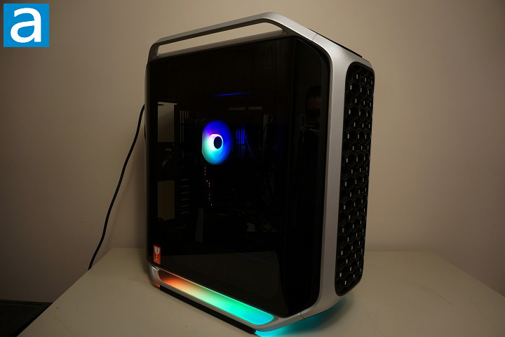 After completing the build inside the Cooler Master COSMOS ALPHA, it was finally time to press the power button and see the system come to life. As shown in the photo above, the integrated ARGB LED lighting strips along the bottom frame immediately illuminate the underside of the chassis, creating a subtle glow that reflects off the surface below the case. Combined with the lighting from the ARGB LED fan on the CPU cooler, the overall lighting effect looks quite impressive through the lightly tinted tempered glass side panel. In my setup, the ARGB LED fan on the CPU cooler was connected to the included lighting hub, allowing all of the RGB lighting elements inside the system to remain synchronized. Lighting modes can be adjusted using the dedicated control button on the top panel, so there is no need to install additional software to change the lighting effects.