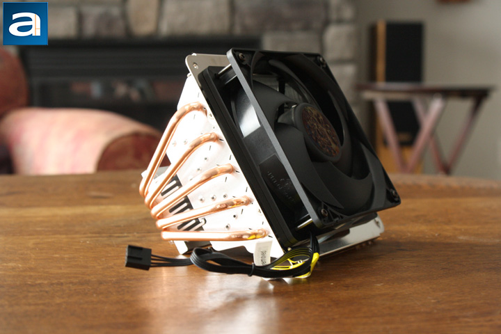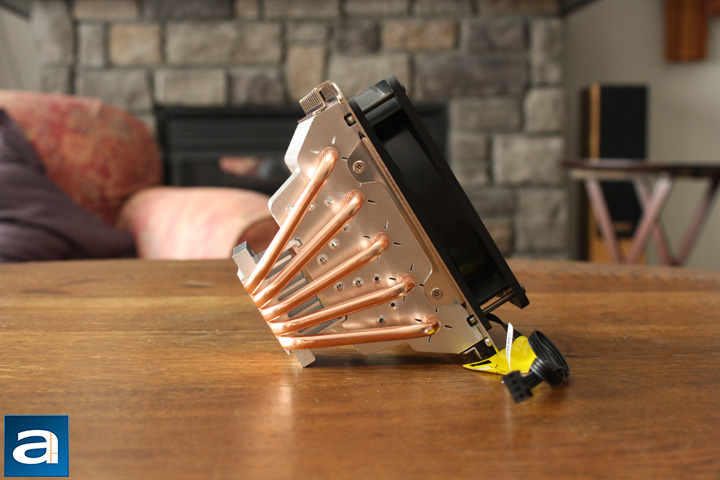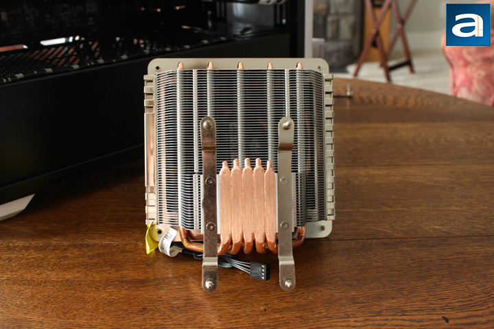 The bottom view shows how the heatpipes make up the copper baseplate. Also, it is a better view of the different design of the cooler. You can see most of the GeminII S524 Ver.2 sort of hangs, and is held up only on one side. This picture does have the mounting hardware attached already, which are the two arms on both sides of the baseplate. The baseplate is flat, but is not very smooth, just because the five heatpipes are grouped together and partially exposed as part of its Continuous Direct Contact design. At the top, you can see the end of the heatpipes, showing they are equally spaced out, meaning the heatpipes equally distribute the heat throughout the cooler. This also ensures there are no problem spots where the heat gets focused. Overall, the Cooler Master GeminII S524 Ver.2 is solidly built, with good quality components. We will have to find out how it performs in just a moment.