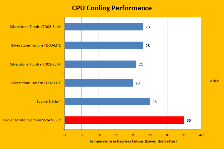 All tests were run in our custom built computer to best reflect real life performance. The computer remained in the same place and room throughout all tests. The ambient room temperature in the room was around 22c. The thermal paste applied to each cooler was stock respective to their manufacturers to rate its performance; all pastes had sufficient time for them to fully settle. The fans on all heatsinks were connected to the same motherboard 4-pin connector. The test computer was turned on and idling for at least one hour for the idling tests. High CPU load results were obtained using Prime95 in-place large FFTs test with eight worker threads for a minimum of ten minutes, and recorded when the temperature is deemed stable. As you can see, there were quite a few other CPU coolers we compared the Cooler Master GeminII S524 Ver.2 to. Temperature results were measured with AIDA64, which reports the CPU's integrated digital thermal sensor for maximum accuracy. Each temperature result was calculated by taking the maximum value of the cores inside the CPU.