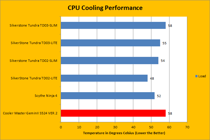 After using Prime95 to put a lot of stress on the CPU, the Cooler Master GeminII S524 Ver.2 stabilized at a respectable 58 degrees Celsius. All of the other coolers on the graph provided a good perspective on whether the Cooler Master GeminII S524 Ver.2 performed well or not, especially considering the GeminII is a smaller air cooler. As you can see, it scored the same as the SilverStone Tundra TD03-SLIM, and from there quite a bit higher than the other coolers on the list. This is pretty good. It did not quite reach the same performance as the Scythe Ninja 4 or SilverStone Tundra TD02-LITE, but they are bigger and more expensive than the Cooler Master GeminII S524 Ver.2.