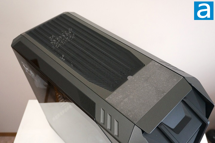 In the above picture, you can see the top panel has a similar design as the rest of the case as the steel panel is bent slightly downward in the front. The mesh for ventilation also narrows down toward the front of case. The mesh here is grooved to prevent indentation and is firmly attached to the top panel. For cleaning, the top panel has to be removed to give access to both sides. Another thing worth mentioning is how the tempered glass side panel is attached to the rest of the case. The gap between the panels is really small and there are no sharp edges. I can tell that Cooler Master did a really good job designing the smooth angled transition between the top panel and side panels. To remove the side panels, users need to remove the top panel first. This is a bit inconvenient, especially if you need to make minor changes. However, this procedure does not need to use any tools either. There is one captive thumbscrew that holds the top panel in place. Once the top panel is removed, both side panels slide off. Essentially, for this case, the top panel and both side panels are locked by one thumbscrew, which brings tool-free installation to a whole other level.