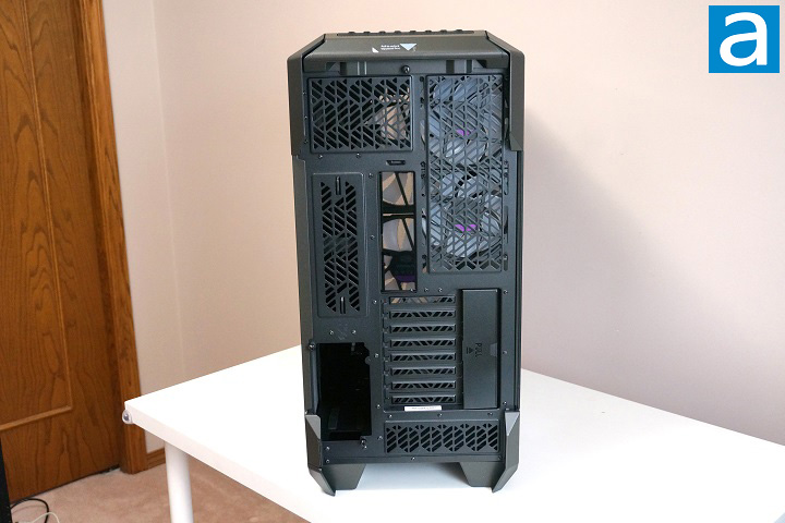 The back of the Cooler Master HAF 700, like the rest of the case, has an emphasis on airflow and cooling. There are four major sections at the back; namely, the power supply mounting area, motherboard I/O backplate, rear exhaust, and expansion card slots. There are also two large area of ventilation grille for airflow. According to the shape of the power supply mounting hole, the power supply is vertically mounted at the bottom left section of the chassis, as viewed from the photo's angle. The PSU mounting place is a bit different from other tower cases in the market. Normally, the PSU is mounted below the motherboard, as in this case, the PSU is mounted behind the motherboard. The result is the HAF 700 is wider than most. Since the power supply has already taken this bottom left position, the I/O backplate opening is located at the right side of the PSU. There are eight conventional expansion slots available on the HAF 700, which means it can easily support as many expansion cards as you need. There is also a vertical expansion card slot to show off your video card. For HAF 700, if you want to actually use this vertical GPU mounting feature, you will need to purchase the mount and extension cable separately, which is surprising given a case of this price and caliber. For the rear exhaust, there are two Cooler Master SickleFlow 120mm fans included from the manufacturer.