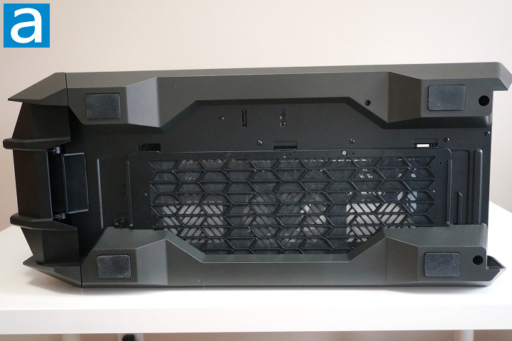 There are two giant plastic stands on the bottom of the case to support the Cooler Master HAF 700, rising the case up about 40mm on top of the resting surface for better ventilation. The two stands are near the two sides of the bottom, so there is no doubt about the stability of the case, especially considering how wide this case is. Meanwhile, there are four rubber strips attached to further enhance the grip of the stands. It is nice to have some rubber feet that can offer some kind of protection to your floor or table surface. You can also see from the above photo a washable filter is on top of the bottom grille of the chassis. The filter is reinforced by a hard plastic frame, so there is no need to worry about the rigidity of the filter. Note the power supply of this case is not horizontally bottom-mounted, therefore the ventilation area behind the filter is actually designed for the bottom-mounted cooling options like fans or radiators.