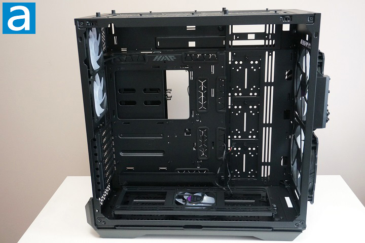 After removing the tempered glass and steel side panels, you can see the internal design of the Cooler Master HAF 700. To be consistent with the exterior, the interior of the case is also painted matte black. The paint is evenly distributed inside the chassis. By default, the air intake is from the front and bottom. The main air intake from the front comes from two Cooler Master SickleFlow 200mm ARGB PWM fans. As for the air intake from the bottom, there is a Cooler Master SickleFlow 120mm ARGB PWM fan preinstalled from the factory. The Cooler Master HAF 700 is quite flexible for its cooling solution configuration, thanks to the large amount of space. Note the CPU heatsink clearance for this product is 166mm, which is pretty good. The case can fit graphics cards up to 490mm in length, which is longer than anything I have ever seen personally. There is no GPU support bracket for horizontally mounted long and heavy graphics card though.