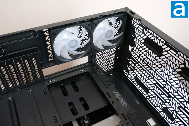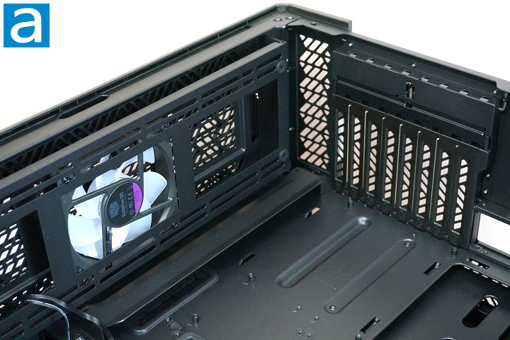From the above photo, you can see there are two Cooler Master SickleFlow 120mm ARGB PWM fans from the factory on the case’s rear exhaust opening. Thanks to the PWM support, the fan can easily be controlled by the motherboard. Having some preinstalled fans is always a good thing, unless in a very unlikely situation, the user wants to use an all-in-one water-cooling system and having the radiator mounted at the rear exhaust. In that case, it would require an extra step to remove the preinstalled 120mm ARGB PWM fans. However, you can also mount the radiator to the top panel. This top grille area can hold up to two 360mm radiator side-by-side or a single 420mm radiator. The top grille is also removable for easy installation of the cooling components.