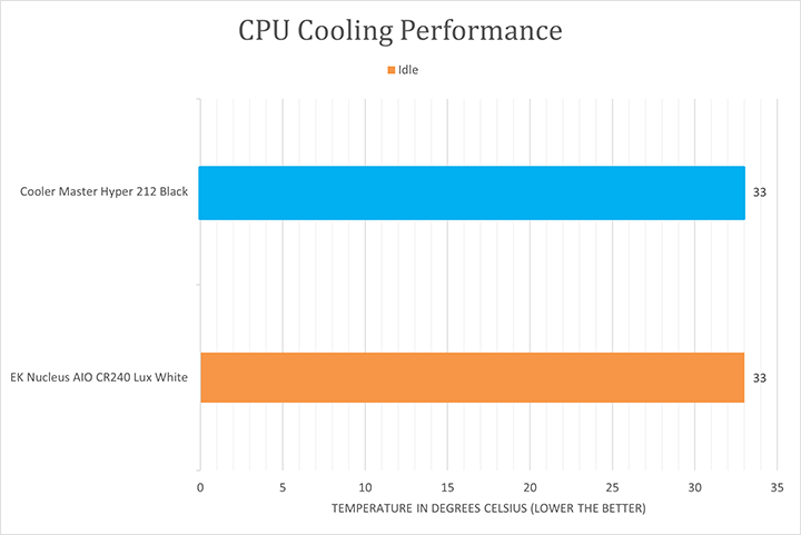 At first glance, you may wonder why there were no comparative results against the Hyper 212 EVO V2 and Hyper 212 Halo White, given I have reviewed both models in the past. The reason is because we are already familiar with the Hyper 212 series, so there are going to be very minor differences between them. As such, comparative results between them will not tell you much. To see how the Hyper 212 Black stacks up against something totally different and with significantly better expected performance, its results were compared with the EK Nucleus AIO CR240 Lux White AIO water cooler. The purpose of this comparison is to find the relative performance between products, but do keep in mind there are different types and performance classes of coolers here.