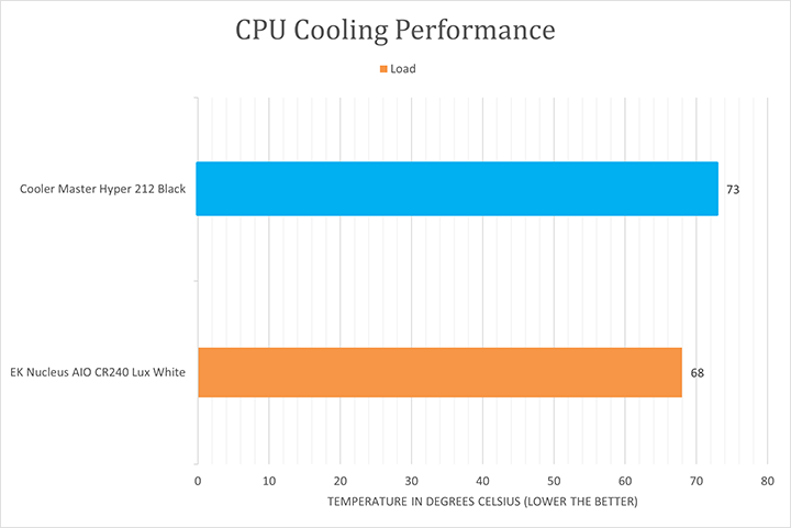 In the idle test, the Cooler Master Hyper 212 Black the Nucleus AIO CR240 Lux White's difference in performance was smaller than anticipated, as the Hyper 212 Black is an air cooler, while the Nucleus AIO CR240 Lux White is an AIO water cooler. That being said, the cooler’s performance was more than satisfactory. Idle test aside, let us look at the test that really matters: Load.