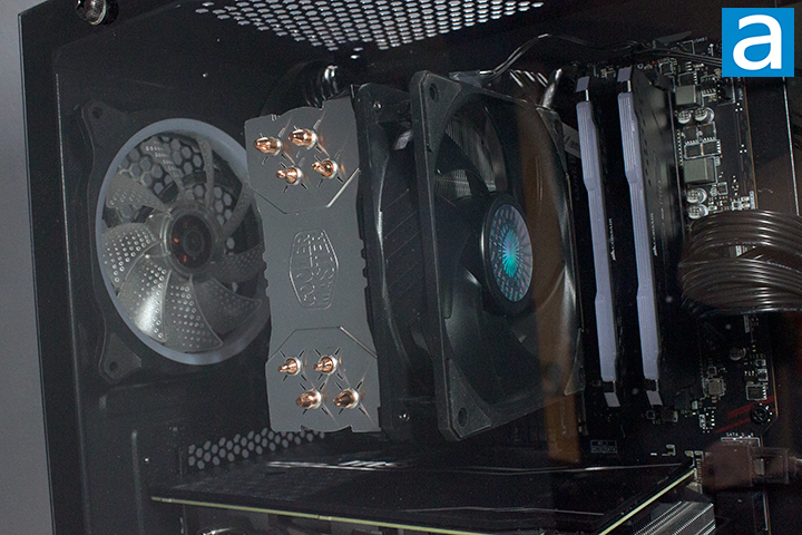 Taking noise into consideration, the sound produced from the cooler is very important for many users. In my setup, I am running the cooler and its fan with an additional four fans inside the case. On a scale of 0 to 10, where 0 is silence and 10 is an explosion, I would rate the Cooler Master Hyper 212 EVO V2 at 1.0 when idling and 4.0 when under heavy loads. The fan was near silent when idle. During heavier loads when the fan was spinning at a higher RPM, the difference in noise was noticeable, but understandable considering its speed and airflow. The Hyper 212 EVO V2 delivered decent cooling performance while being quiet at low loads.