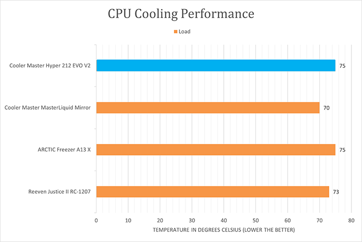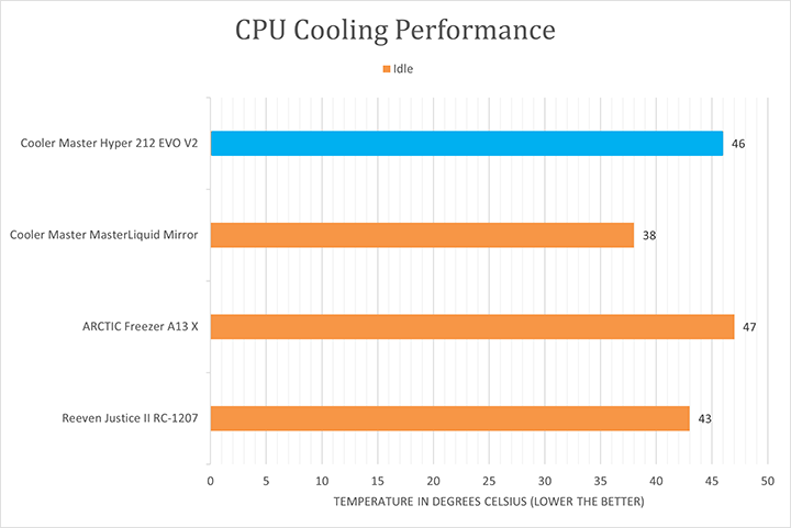 All tests were run in our custom-built computer to best reflect real-life performance. The computer remained in the same place and room for all tests. The ambient temperature of the room was roughly 18 degrees Celsius. The thermal paste applied to each cooler was stock respective to their manufacturers to rate its performance. Sufficient time between testing was ensured for the paste to settle. The fans on all heatsinks were connected to the same motherboard's 4-pin connector. The test computer was turned on and idling for at least one hour for the idling tests. High CPU load results were obtained using the Prime95 in place large FFTs test with sixteen worker threads for a minimum of fifteen minutes and recorded when the temperature was deemed stable. The Cooler Master Hyper 212 EVO V2 was tested using the stock fan sent from the factory. The performance was compared with the Cooler Master MasterLiquid ML280 Mirror, ARCTIC Freezer A13 X, and the Reeven Justice RC-1207. The purpose of this comparison is to find the relative performance between products, but do keep in mind there are different types and performance classes of coolers here. The temperature results for each cooler was measured with CoreTemp, which records the CPU’s integrated thermal sensor for maximum accuracy. Each temperature result was calculated by taking the maximum value of the cores inside of the CPU.
